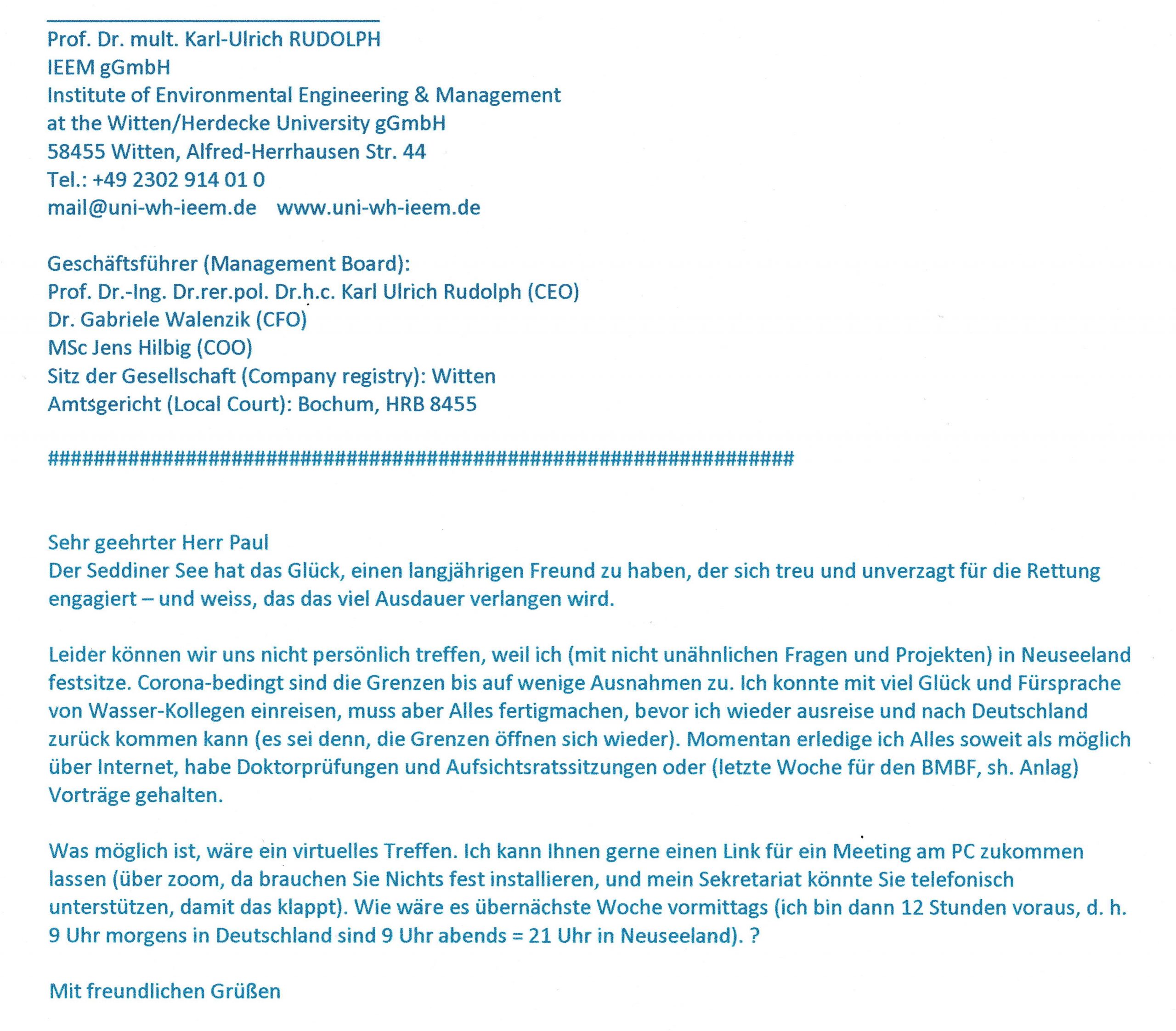Herr Prof. Dr.-Ing. Dr. rer. pol. Dr. h. c. Karl Ulrich Rudolph An Herr Prof. Dr.-Ing. Dr. rer. pol. Dr. h. c. Karl Ulrich Rudolph habe ich mich gewandt, weil er für mich einer der führenden oder gar der führende Wissenschaftler auf dem Gebiet der Klärwerksproblematik in Deutschland und darüber hinaus ist. Zudem viel Erfahrung beim Bau von Klärwerken sowohl im In- als auch dem Ausland hat. Hier seine Stellungnahme: